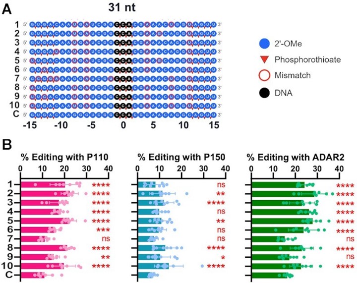 Testing top guide RNAs in cellula. (A) A map of the chemical modifications within the stabilized 31 nt ASOs of the 10 most abundant gRNAs as well as the control gRNA sequences. ASOs (100 nM) were transfected into HEK293T cells transiently expressing mCherry_P2A_eGFP W58X (UAG) and hADAR1-p110, hADAR1-p150 or hADAR2. (B) Percent editing of the top 10 31 nt gRNAs from the selection assay in comparison to the control. Asterisks denote statistically significant differences in comparison to the control gRNA (Two-way ANOVA, **** P < 0.0001, *** P < 0.001, ** P < 0.01, *P < 0.05, n.s. not significant). Error bars represent S.D., and for all data points, n = 8.