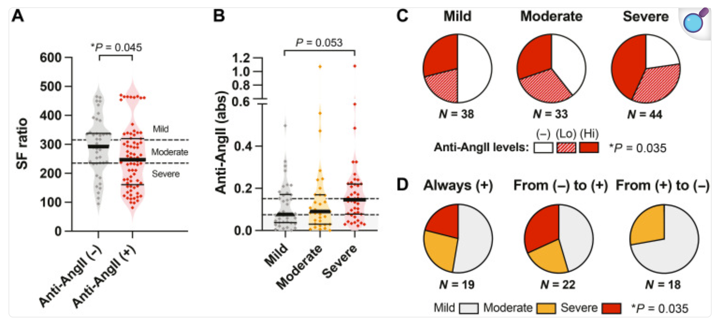 Anti-AngII autoantibodies correlates with reduced pulse oxymetric saturation SpO2/FiO2 (SF ratio) in hospitalized patients with COVID N = 115)
